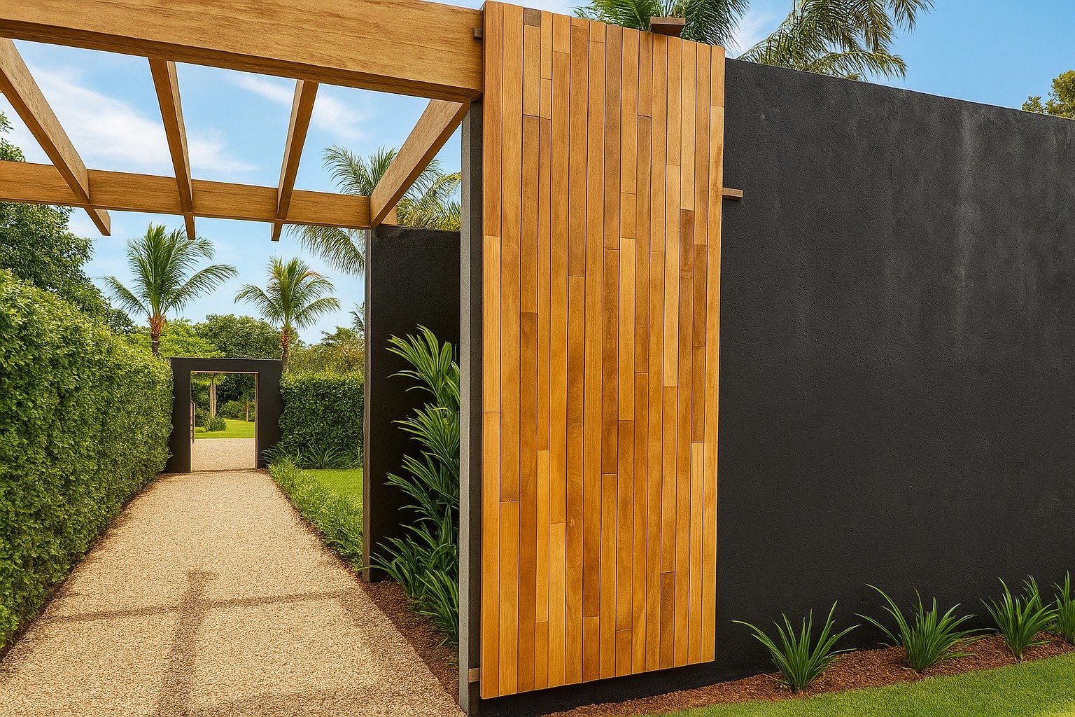 O portal de madeira da Madeireira 41, é desenvolvido na madeira Canelão e Cedro Arana, oferece presença marcante, resistência superior e acabamento de alto padrão. Seu design imponente valoriza imediatamente a fachada, garantindo mais segurança, estilo sofisticado e durabilidade excepcional. Uma solução premium que transforma a entrada do imóvel e eleva o nível do seu projeto com elegância e impacto visual.